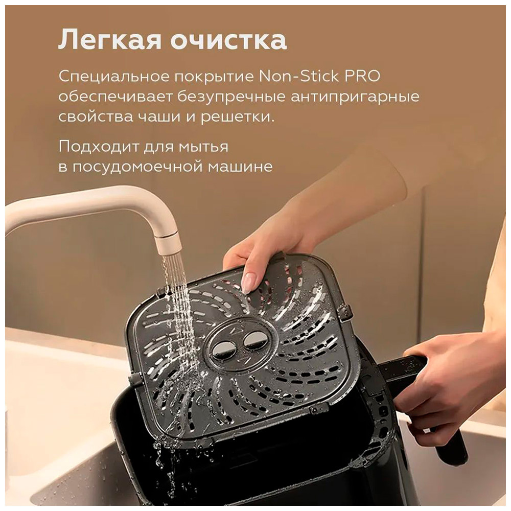 Прибор оснащен антипригарным покрытием Non-Stick PRO, что облегчает уход за ним и позволяет готовить с меньшим количеством жира. Вы сможете избежать пригорания пищи, легко извлекать готовое блюдо и быстро очищать рабочую поверхность аэрогриля.
