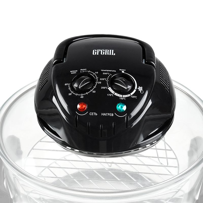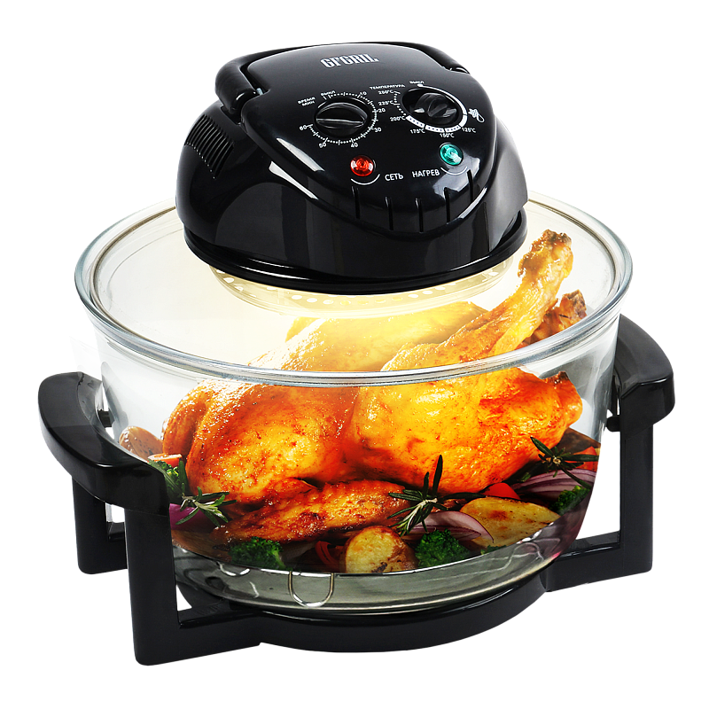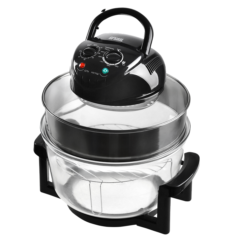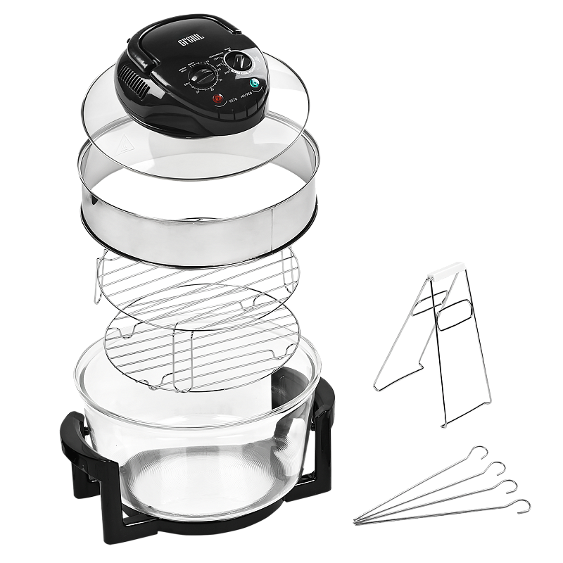 Комплектация - Корпус аэрогриля с чашей, Шампуры (4 шт), Решетка высокая, Решетка низкая, Щипцы-ухваты, Расширительное кольцо