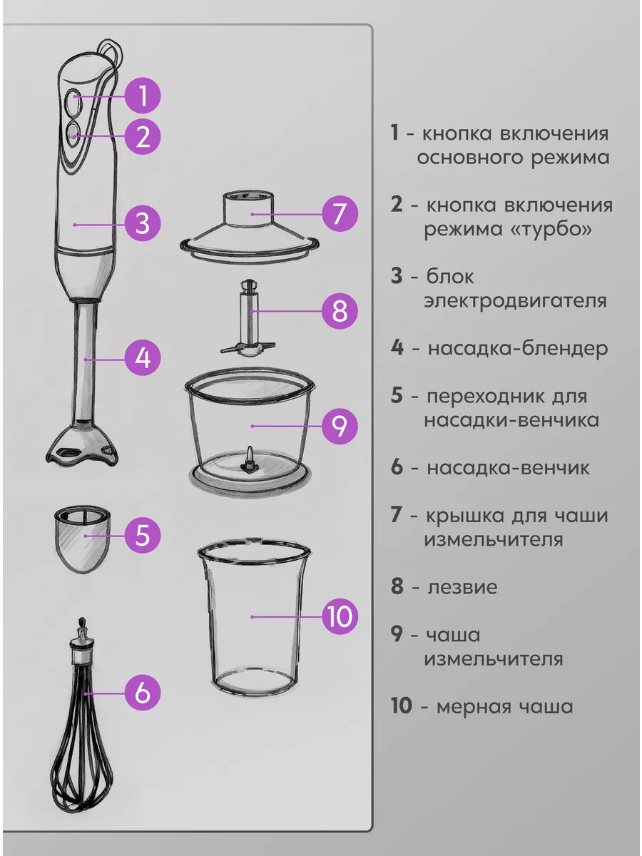 Комплект блендера может включать в себя не только измельчитель, но и дополнительные предметы, такие как чаша для крошения, мерный стакан и венчик.