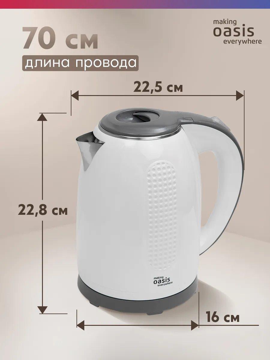 Электрический чайник making Oasis everywhere – удобное решение для быстрого нагрева воды. Компактные размеры позволяют разместить устройство там, где свободного места практически нет. Современный дизайн гармонично впишется в любой кухонный интерьер, подчёркивая безупречный вкус.