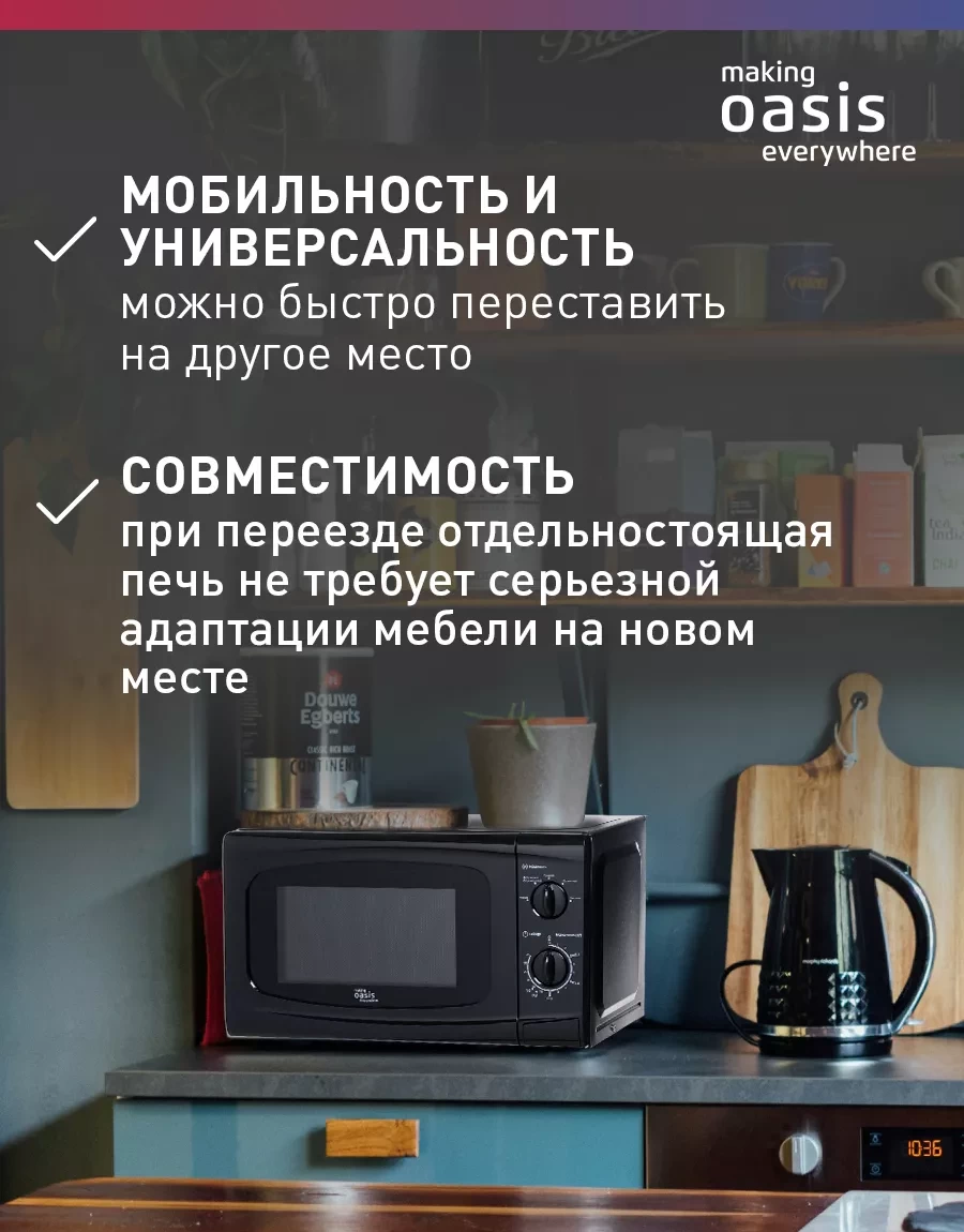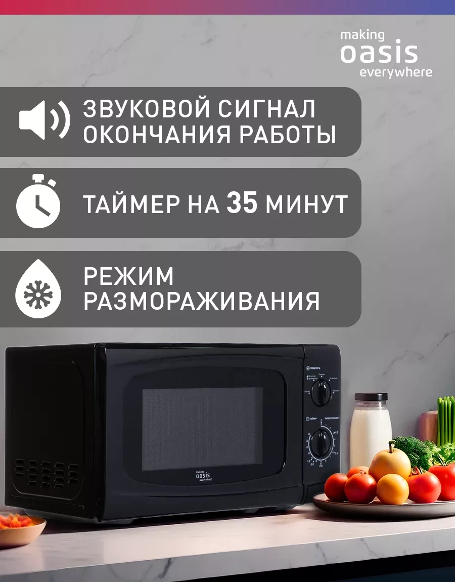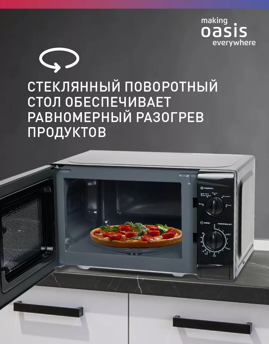 Микроволновая печь making Oasis everywhere – устройство для тех, кому важно поддерживать высокий темп жизни. Большая мощность гарантирует быстрый разогрев еды. Также в микроволновой печи можно готовить простые блюда, что экономит время.