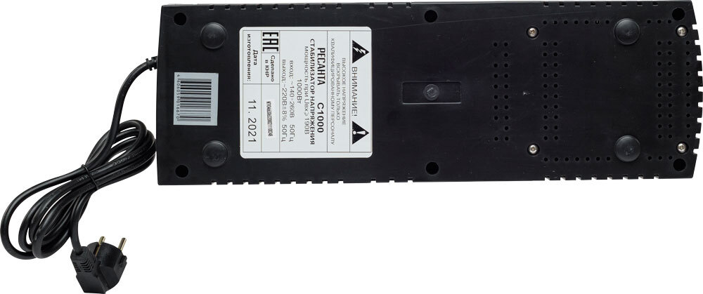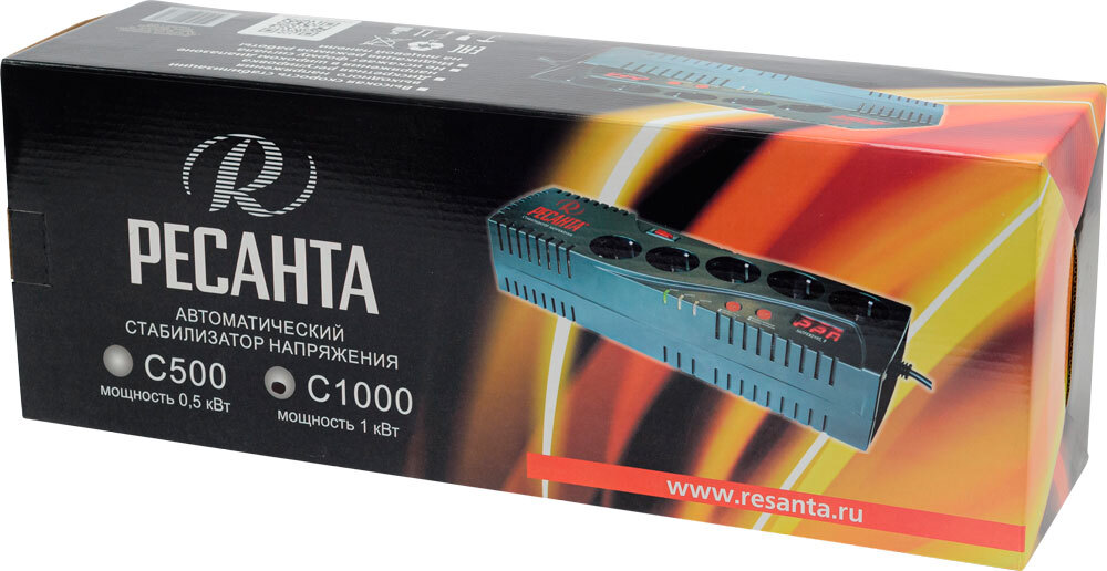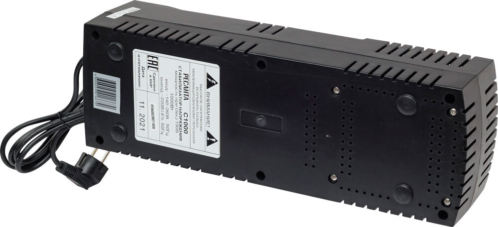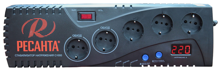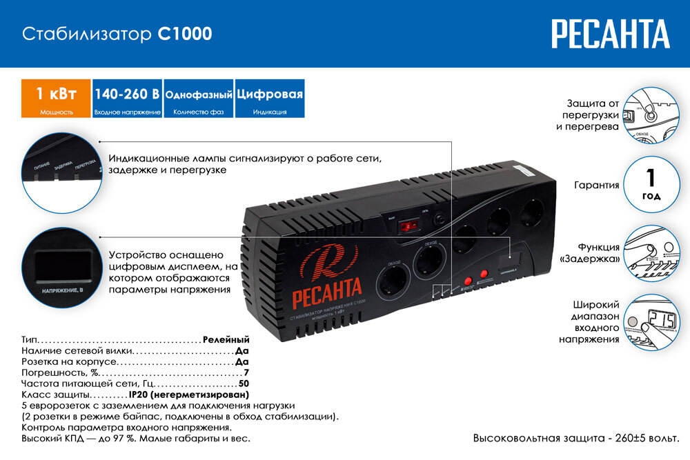 Данный стабилизатор оборудован 5 розетками, 2 из которых имеют функцию байпас. Кроме того, есть возможность увеличения задержки включения стабилизатора при коротком отключении электроэнергии, что позволяет защитить высокочувствительную технику. Также прибор имеет дисплей с возможностью отображения входного и выходного напряжения. Номинальная мощность при входящем напряжении 190В составляет 1000Вт.