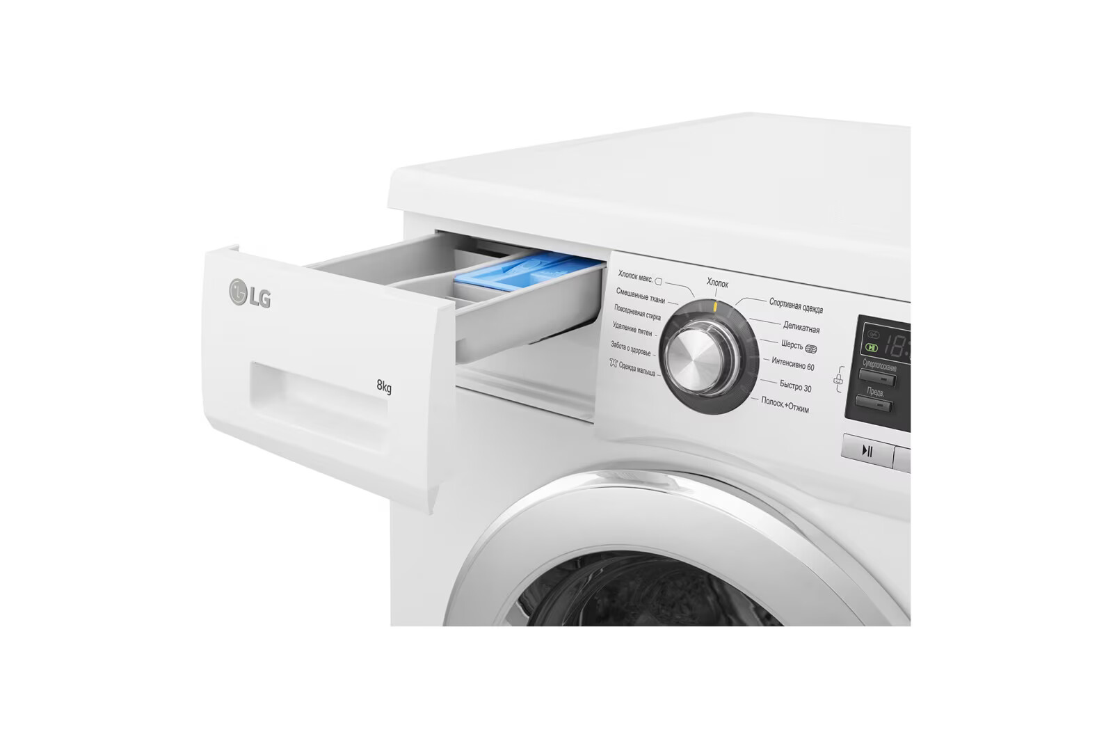 Программы Хлопок, Хлопок Эко, Смешанные ткани, Забота о здоровье, Удаление пятен, Одежда малыша, Спортивная одежда, Повседневная стирка, Деликатная, Шерсть, Интенсивно 60, Быстро 30, Полоскание+Отжим