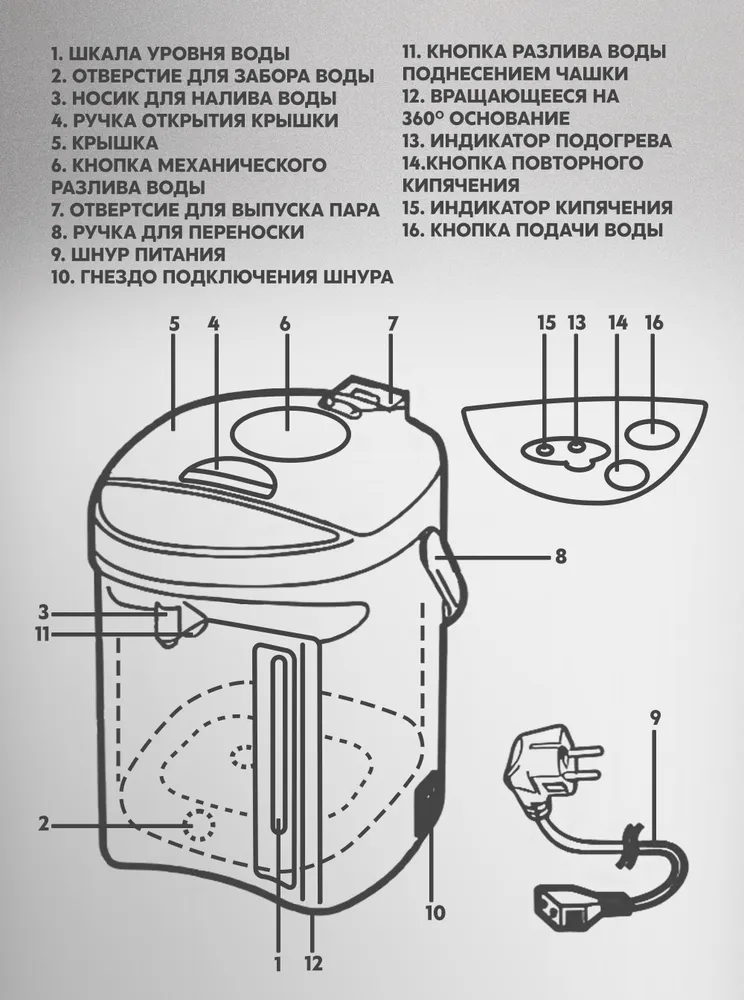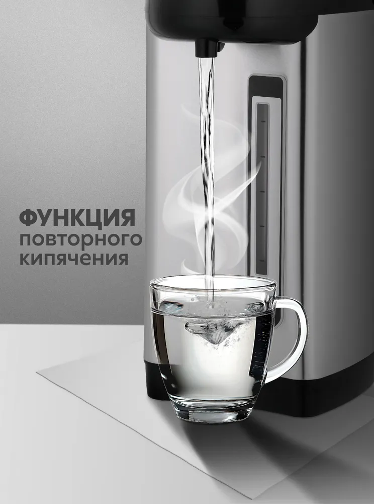 Устройство оснащено несколькими режимами нагрева и поддержания температуры, от быстрого кипячения до деликатного подогрева. Благодаря большому объёму резервуара воды будет достаточно даже если у Вас гости. Удобная система подачи позволяет легко налить кипяток даже одной рукой, без лишних усилий.