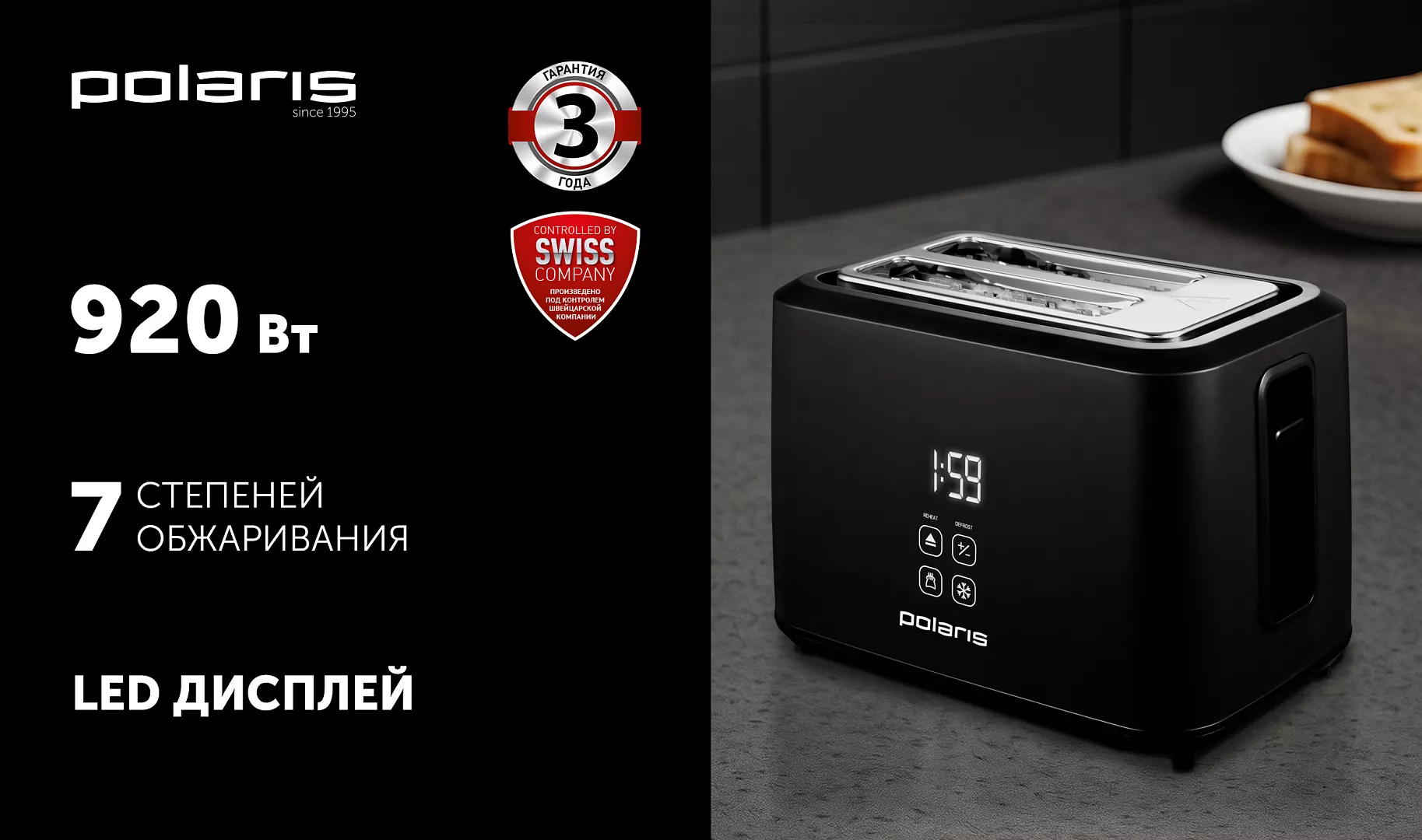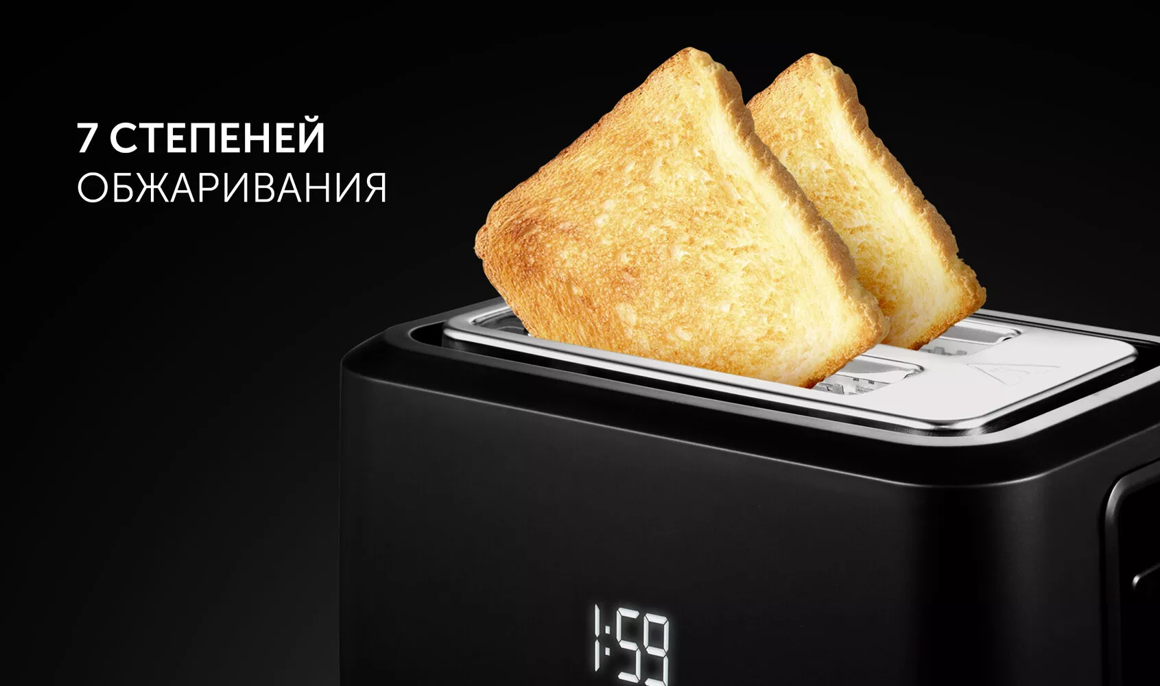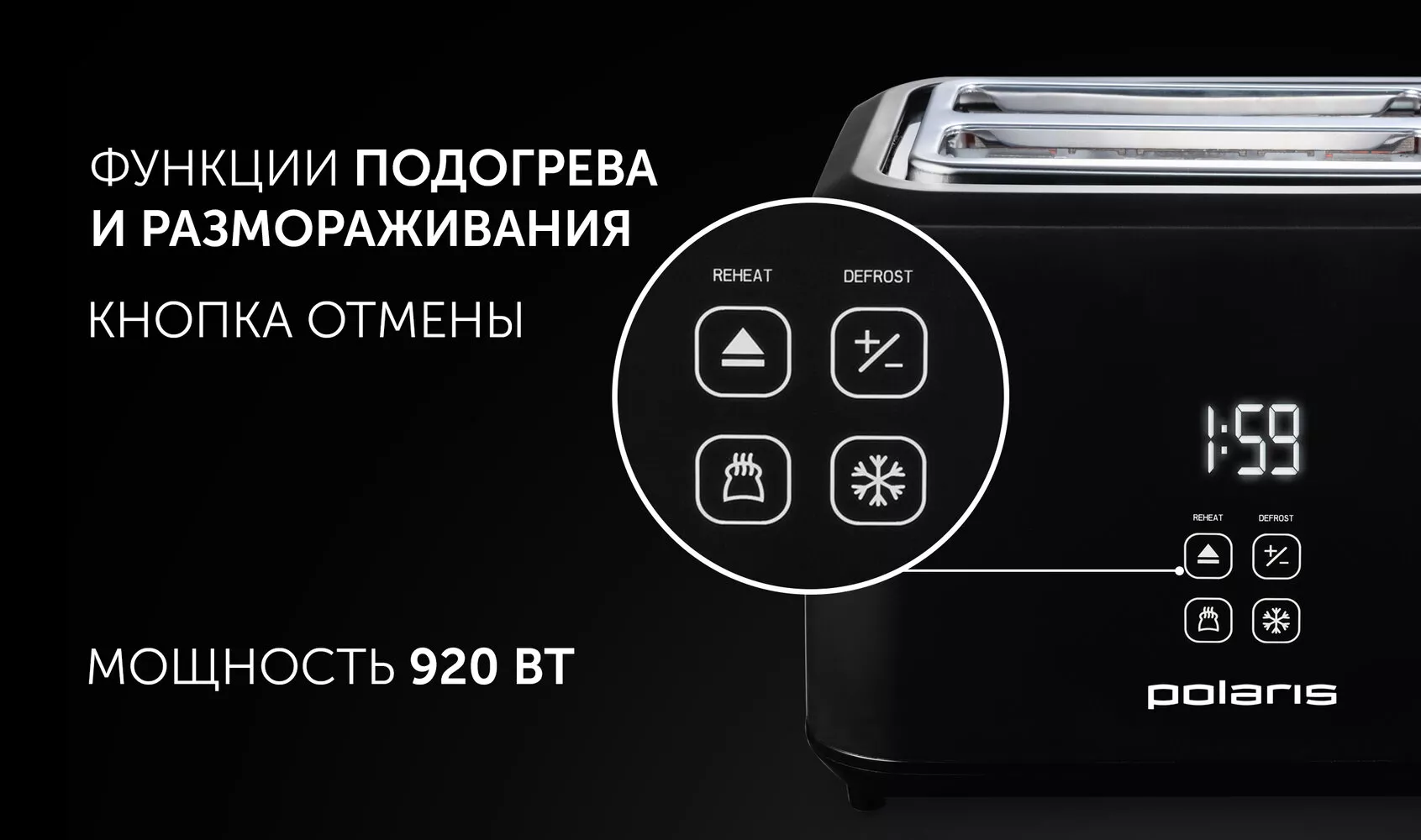Дополнительные функции - автоматическое поднятие тостов, автоматическое центрирование тостов, кнопка отмены, плавная регулировка температуры, регулировка степени обжаривания